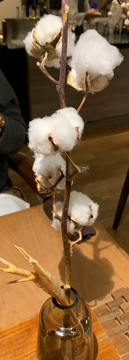 そして綿! 皆さんが本当に興味があるのは綿ですよね。分かります。枝はレポで会ってるけど綿は初見ですからね。実はこれ、食べられる綿が2つしかないんですよ! 初見殺しすぎる……! 説明がなければ全部の綿をちぎって口に入れるところでした。食べられる綿は綿菓子で出来ていて、残りは本物のふわふわコットンでした。ノンアルの飲み物が全然甘くなかったので、綿をちぎっては食べ、合間に飲みつつ、またちぎり……。綿の中にはナッツを丸めたものが入っていたので、リスが雪の下に埋めた非常食を掘り起こす行為の暗喩か……!?我々がリスってこと!?となった自分ですが「綿の種を表現してると思いますよ」と突っ込まれたので、必要なのは冷静な同行者だなと思いました。