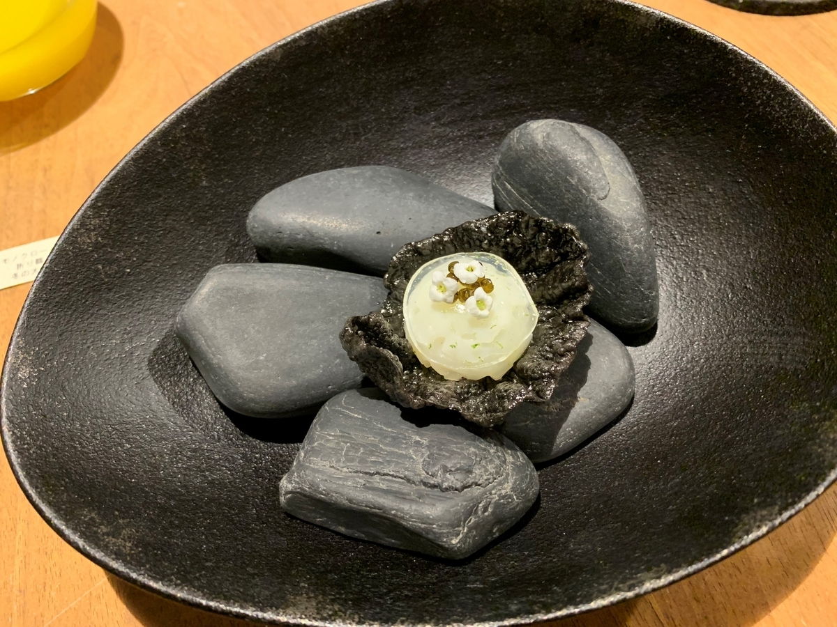 さて水を味わうのもそこそこに次の料理です。パンチの効いたメニュー名ですよね。名前から和の気配を感じますが、本当に何が出てくるんだ……と、そわそわする我々の前に置かれたのが、こちら。