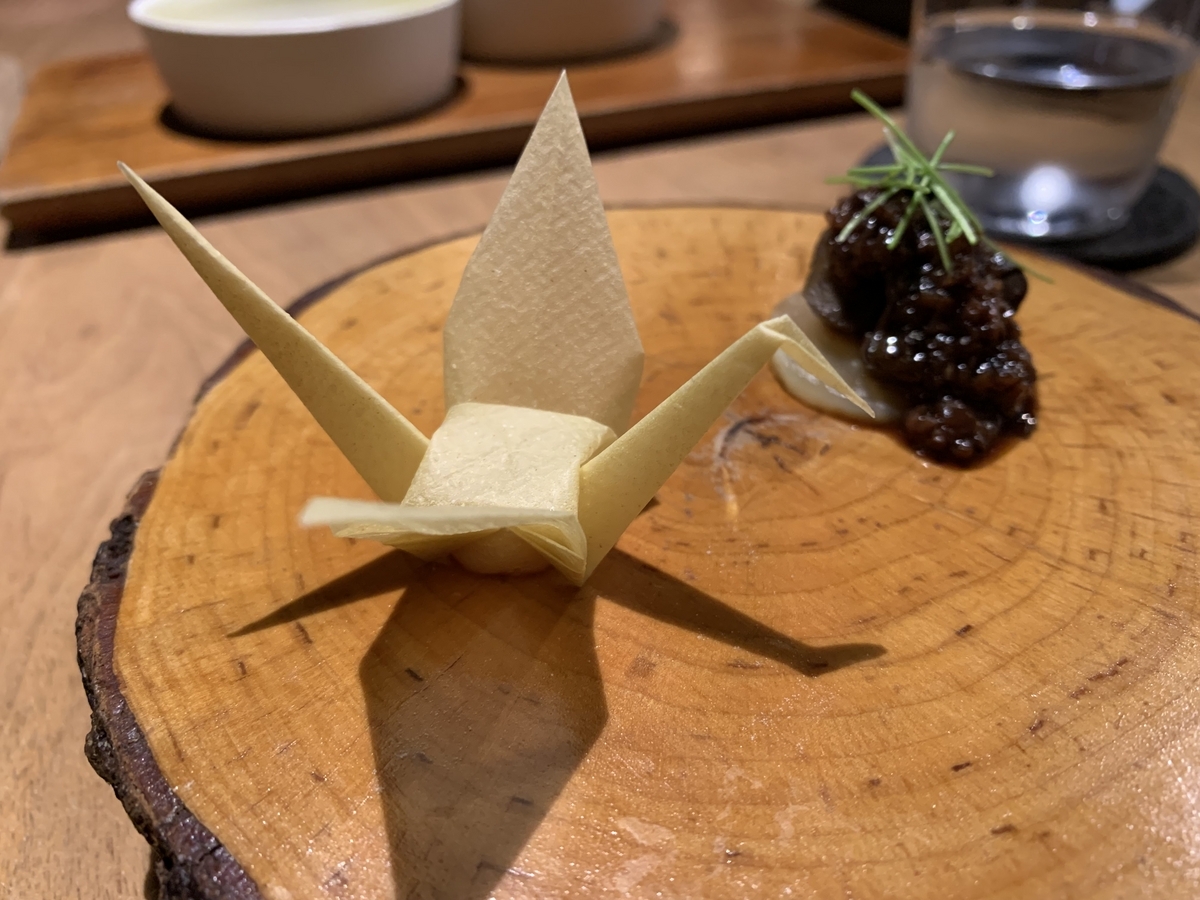 えっ。折り鶴(概念)の方がきた!? と思ったら、これはあとでお使いくださいとのことで、折り鶴ではありませんでした。びっくりした。 めっちゃ黄色いな……。オリーブオイルのようですね。そんなドッキリを挟みつつ今度こそ運ばれてきた折り鶴がこちら!