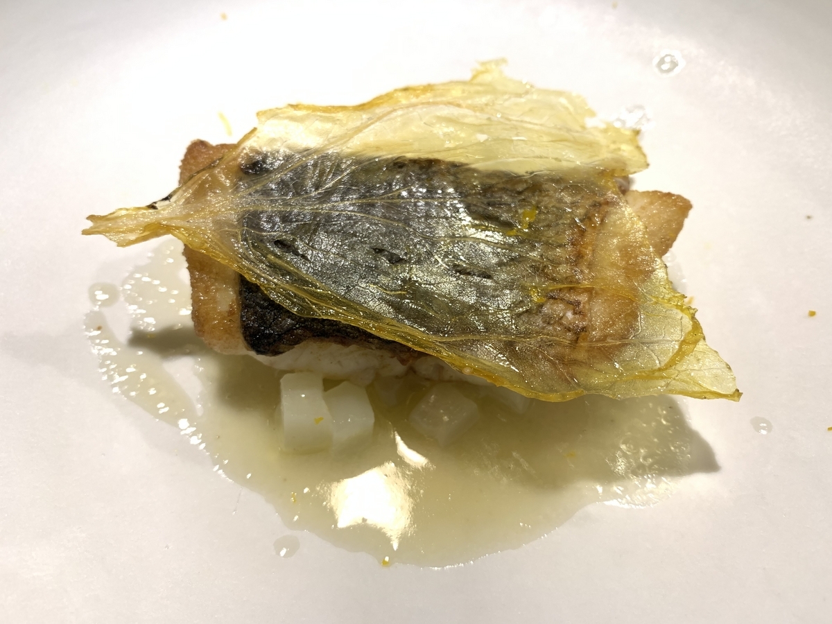 これ、ヒラスズキのムニエルかな? 程よく外側がカリッとしつつも中の身はふんわり、そこにバターを絡めて食べる……。美味しい。お酒のことは分からないけど、日本酒でもワインでも合いそうな気がします。そもそもスズキ自体を全然食べたことがないので、ヒラスズキとスズキの比較ができないのですが、とっても美味しい白身魚でした。写真だと分かりにくいのですが、柚子を細かくしたものが周りに散りばめてありました。柚子のさっぱりした風味から爽やかな空気を感じられてまた良いんですよ〜!!