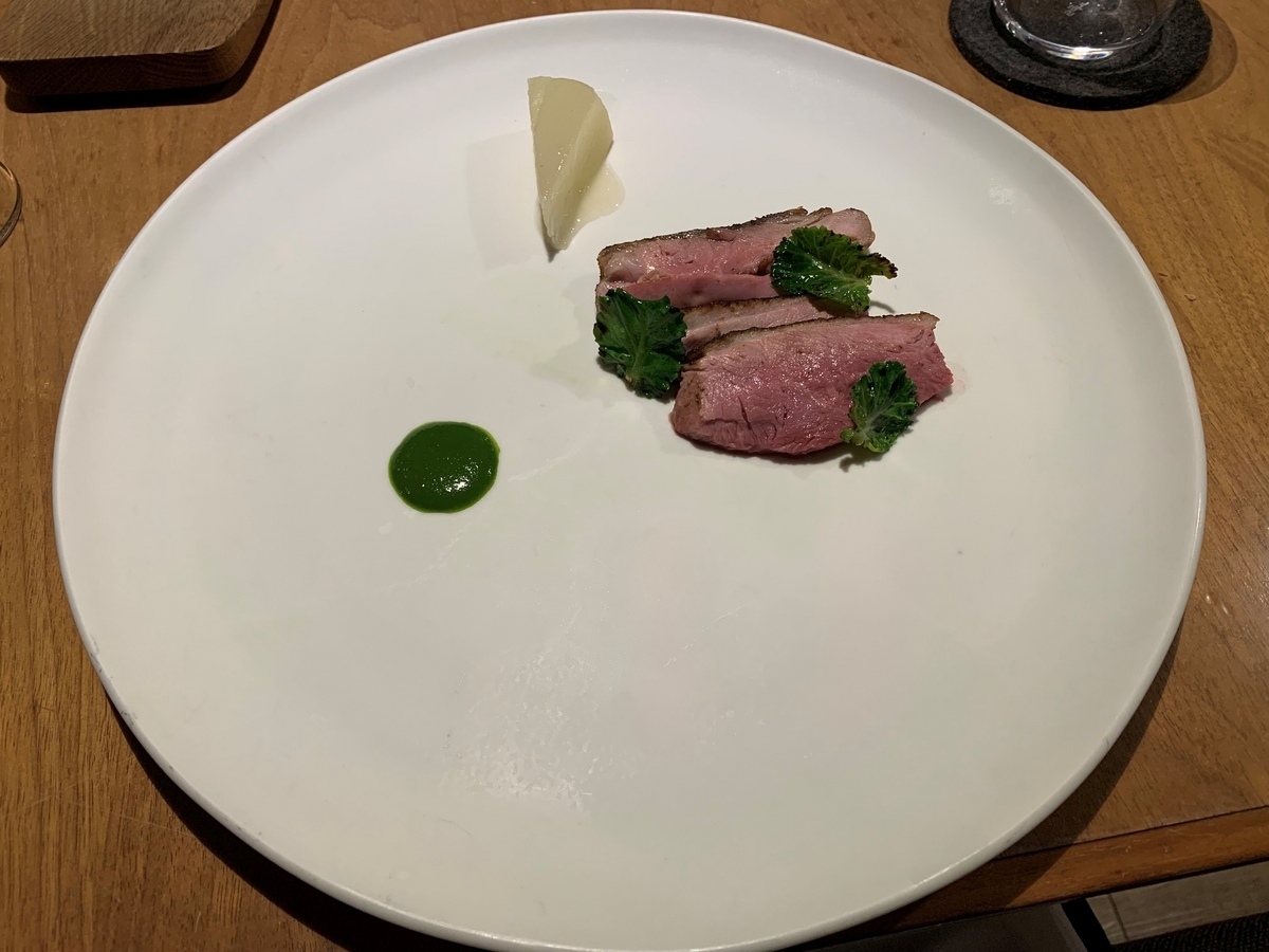 で、本題。鴨が本題じゃないんかいと思われるかもしれませんが……写真の真ん中少し左に緑色の丸がありますね? これは春菊のソースです。これがこの料理の真の主役です。春菊……自分はお鍋なんかによく入れるのですが、苦くて若干のえぐみと独特の味のする葉っぱみたいな印象があります。それが、このソースめちゃくちゃすごくて! 春菊の独特の味と苦味は残しつつ程よくえぐみだけ引き下げてて鴨にも大根にも合う! 特に鴨! この鴨は絶対春菊のソースを背負うために生まれたよ!! 本当にもう……この春菊のソースを食べるために鴨を食べていた……。メインディッシュのラストを飾るだけの理由が詰まってると感じました。すごかったです……。