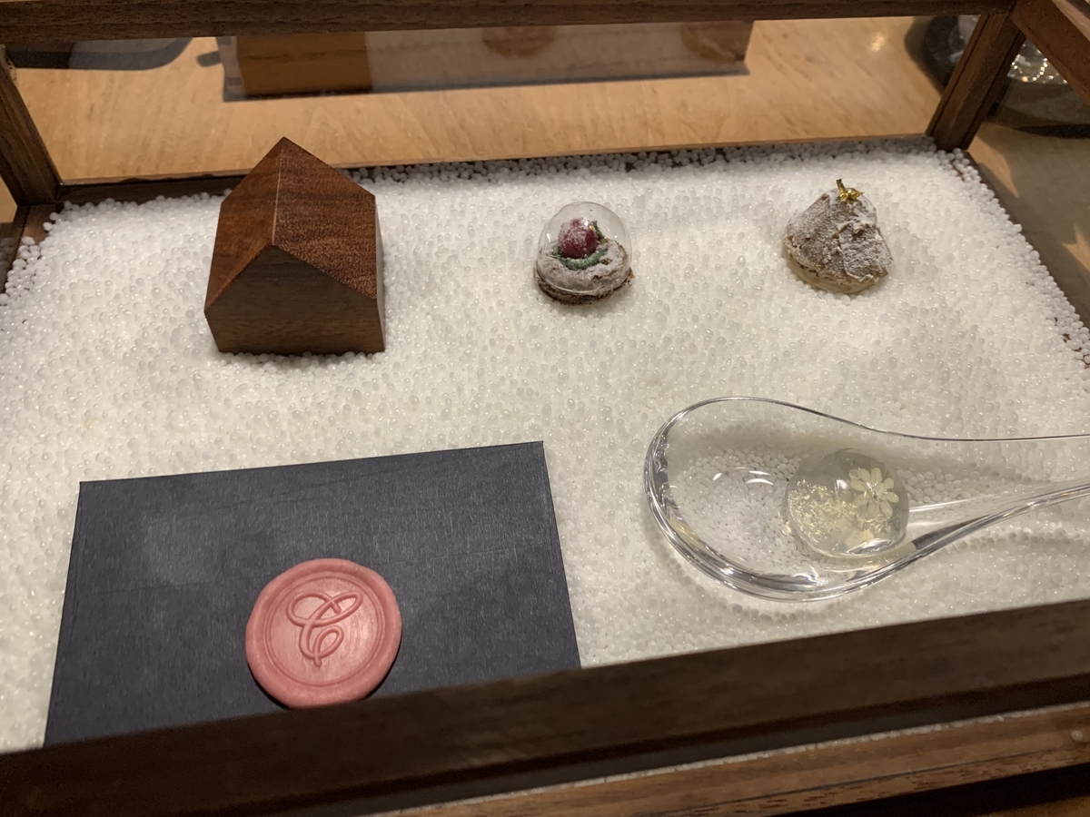写真でこの感動が伝わりますでしょうか? 冷やされたガラスのケースの中に可愛らしいお菓子が並んでいます。 ケースを結露させることで、曇りガラスを表現しているんです。寒い冬の日の結露した窓みたいだ……。発想が美しい。